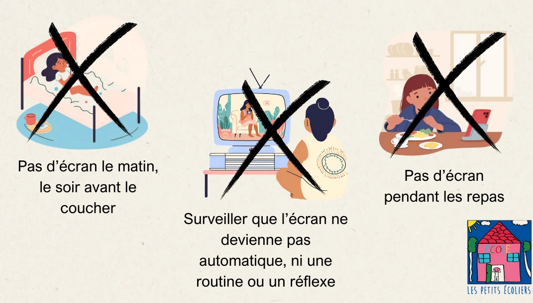 - Surveiller que l’écran ne devienne pas automatique, ni une routine ou un réflexe face à un comportement